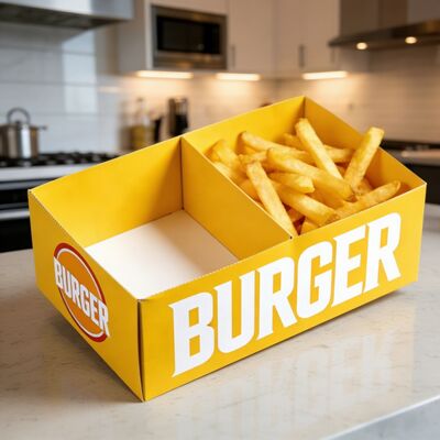 Our customized disposable burger boxes are not just packaging—they are a marketing tool. Printed with your brand logo, these boxes enhance brand recognition while providing a premium takeaway experience. Using eco-friendly corrugated paper, they appeal to environmentally conscious customers and reduce your restaurant's carbon footprint.